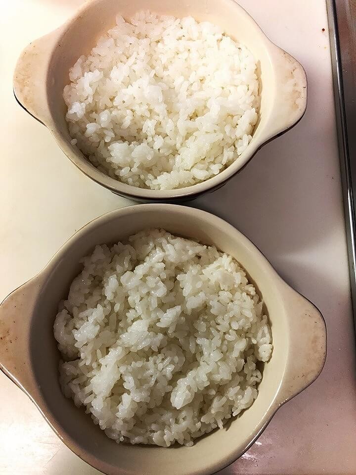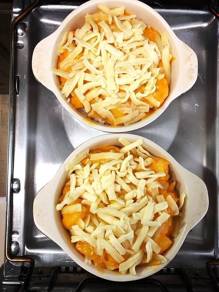 グラタン皿にお茶碗1杯分の温かいごはんを乗せ、その上にソースを乗せます。