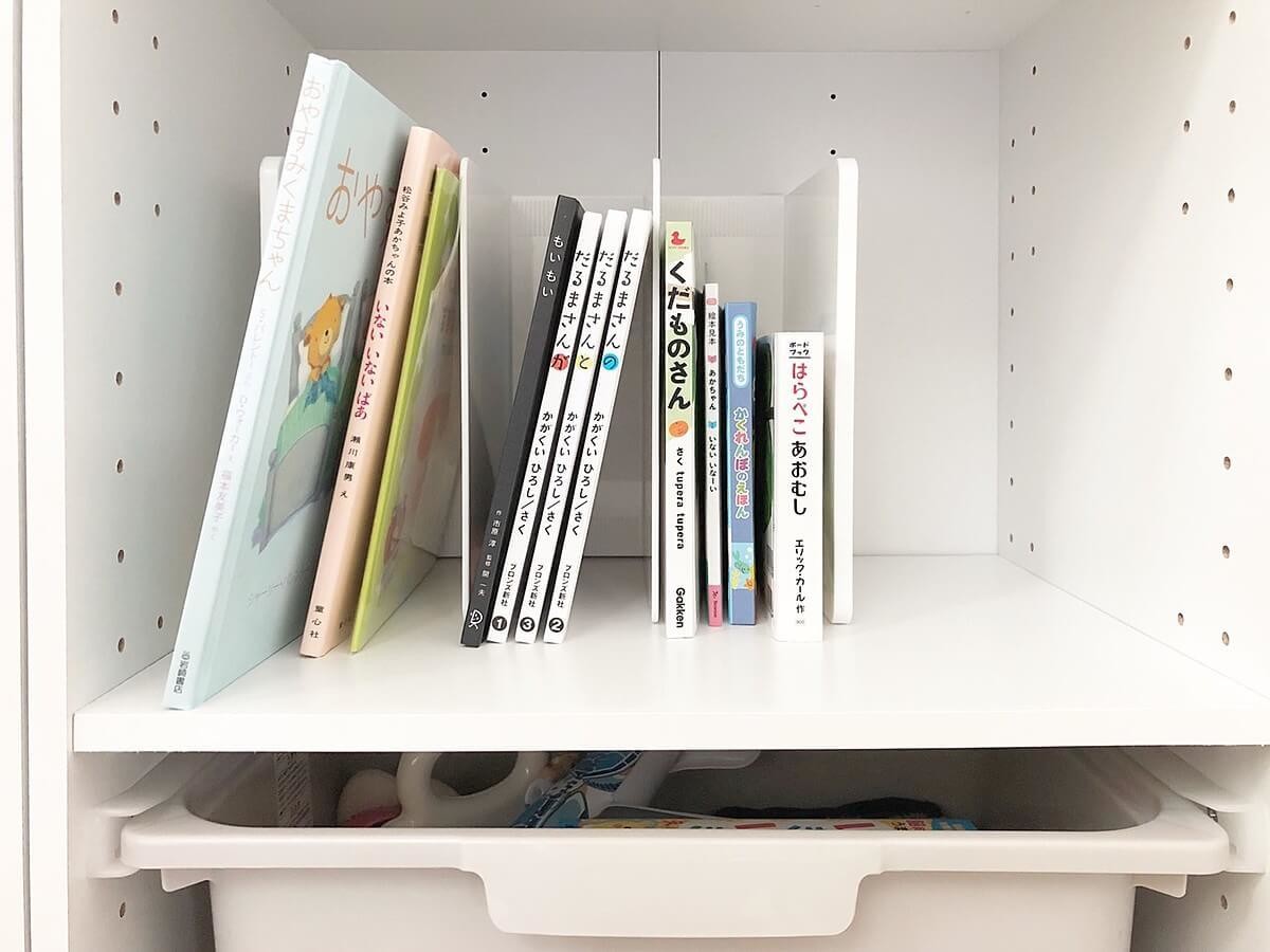 絵本はブックスタンドを使って倒れてこないようにしているのですが、ブックスタンドの置き方に一工夫。