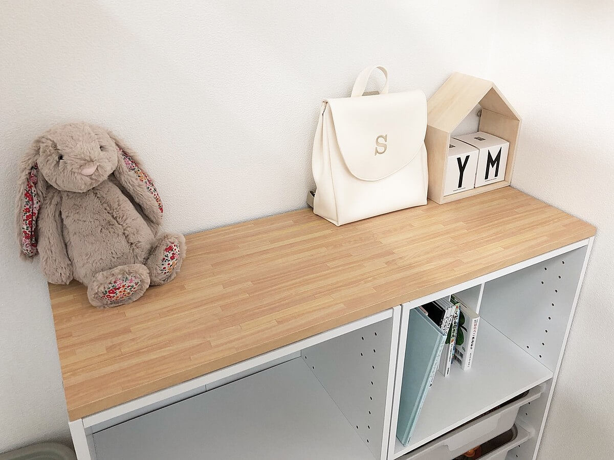 リビングに置いているので、少しでもインテリア性が出るように、2つのカラーボックスを覆うように天板を乗せてあります。