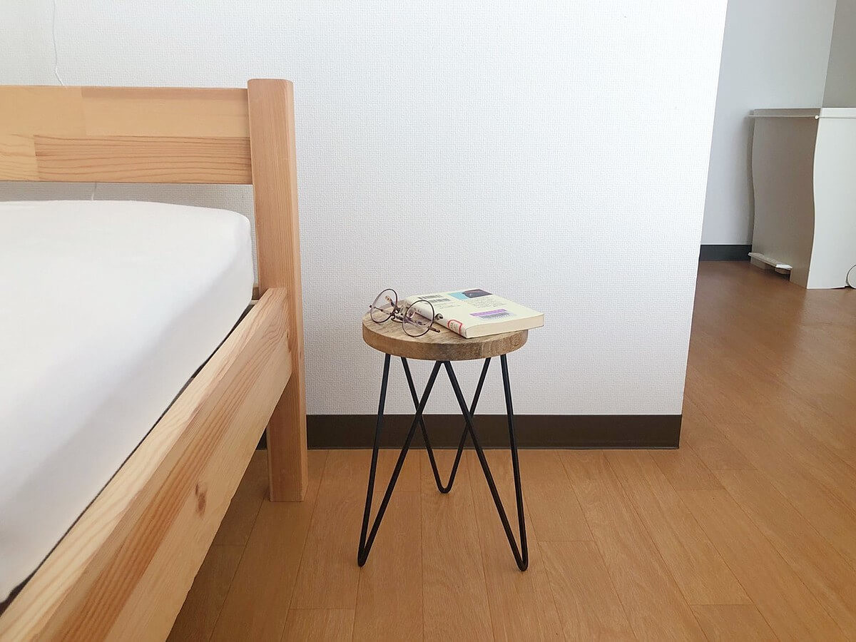 ベッド横にこのサイズ感のテーブルがあると意外と便利。文庫本1冊とメガネを置けるちょうどいいサイズです。