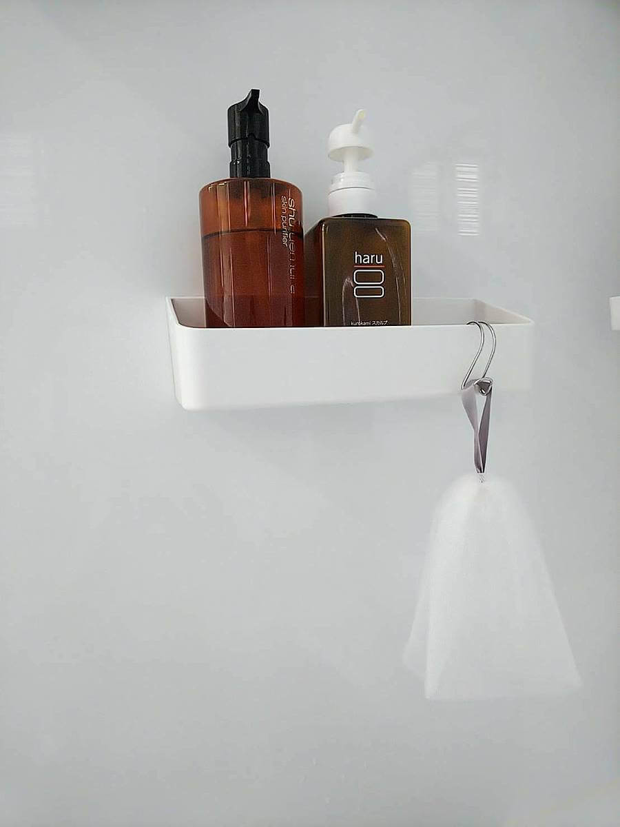 壁に付けることで水垢が付くのを防止できます。 フックを使ってネットやスポンジを掛ける事もできるので便利です。
