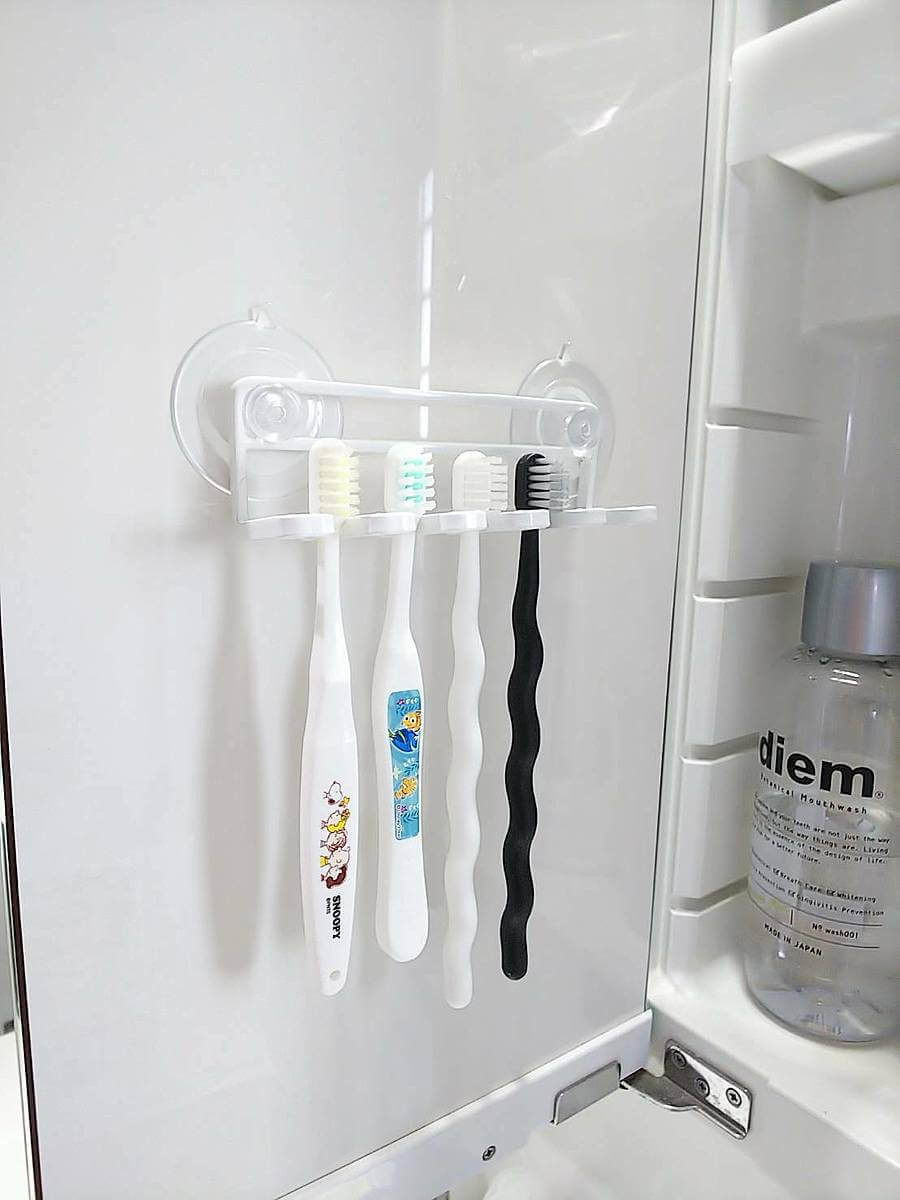 使い終わったら歯ブラシホルダーにかけるだけで自然乾燥できるのでこちらも衛生的。水が溜まることも無いので掃除の頻度が下がります。