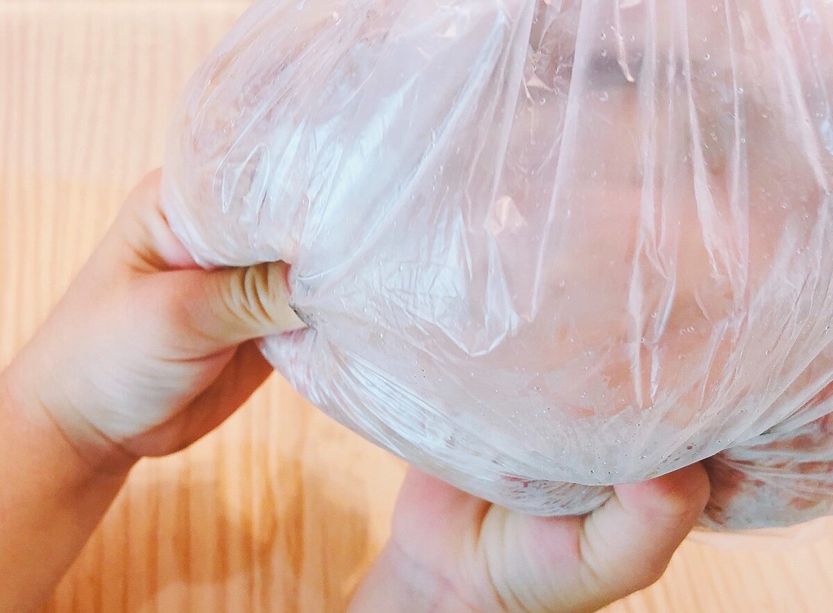 ④ 食品用のポリ袋に☆と鶏ひき肉を入れて、粘りがでるまでしっかり混ぜておきます。