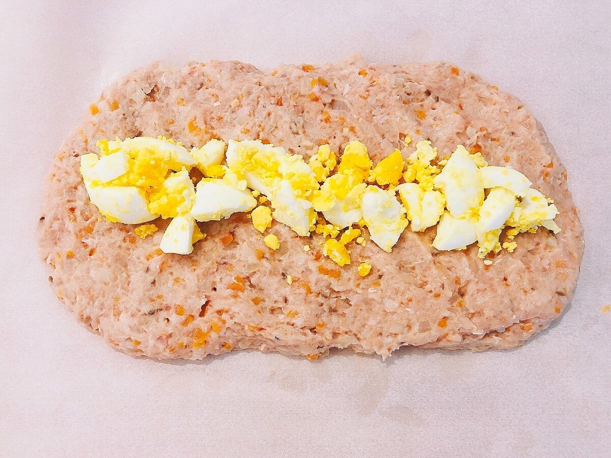 ⑥ クッキングシートを2枚準備し、⑤を2つに分けて平らにのばして、真ん中に粗くつぶした茹で卵をのせます。