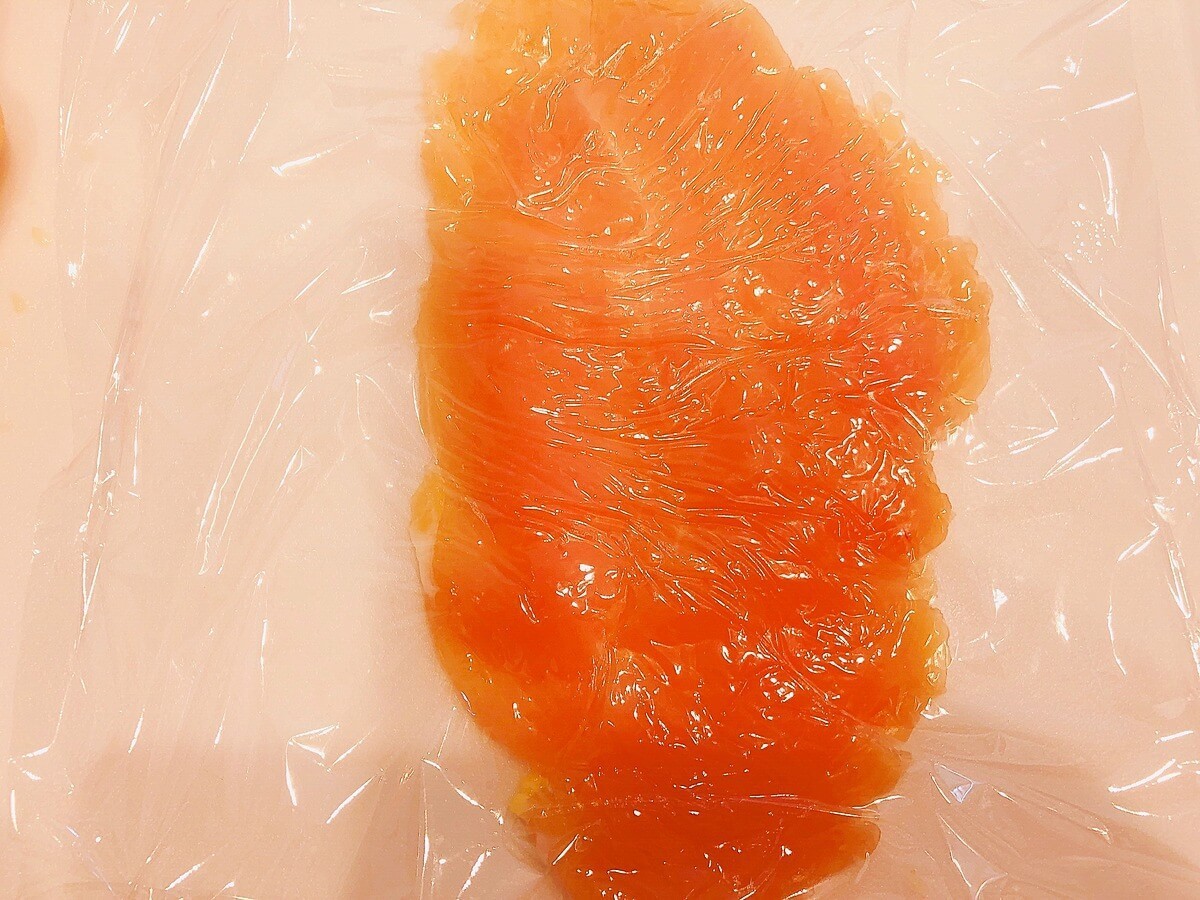 ② ささみは太い筋を包丁などで除いてまな板の上に置き、その上にラップをかぶせて麺棒などで軽く叩いて薄くのばし、軽く塩を振っておきます。