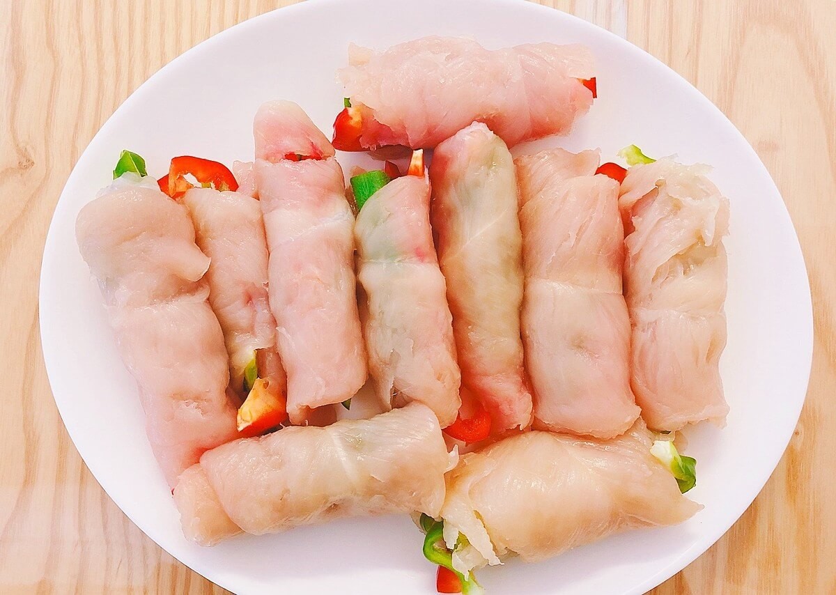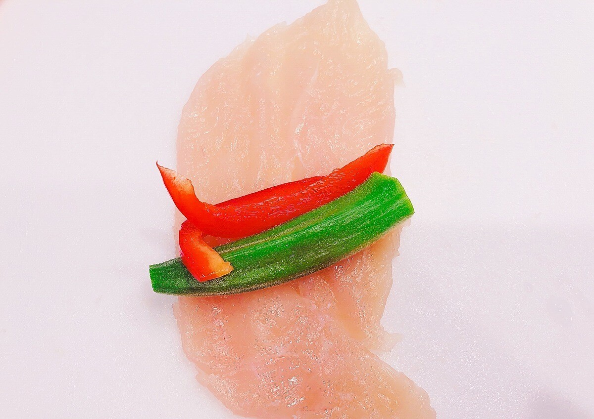 ③ ささみの上にお好みの野菜をのせ、くるくるとまいていきます。