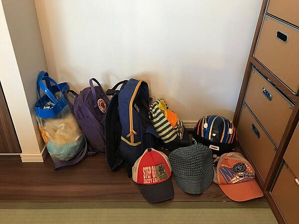リュックや帽子、自転車用のヘルメット、サブバッグなどがずらりと床に。 実際はリュックはリビングに放り投げてあったり、帽子は玄関にそのまま置いてあったりと散々でした。 冬はこれにコートも加わりますね。
