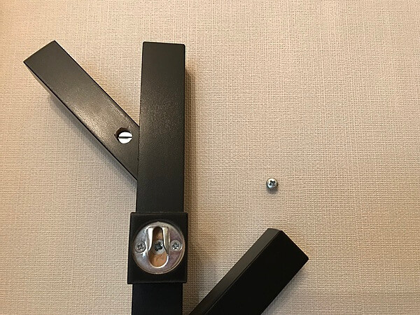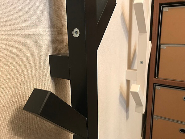 壁にねじを打ち込み、そのねじをフックの裏側の穴にひっかけるだけですが、結構しっかりと固定されます。 ねじで留める場所は1セットに二か所あります。