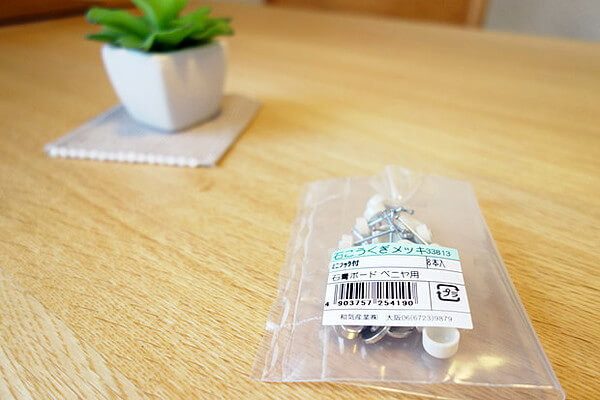 そこで取り入れたのが、和気産業の「石こうくぎメッキ ミニフック付」。 石膏ボードに付ける、フックとくぎのセットです。