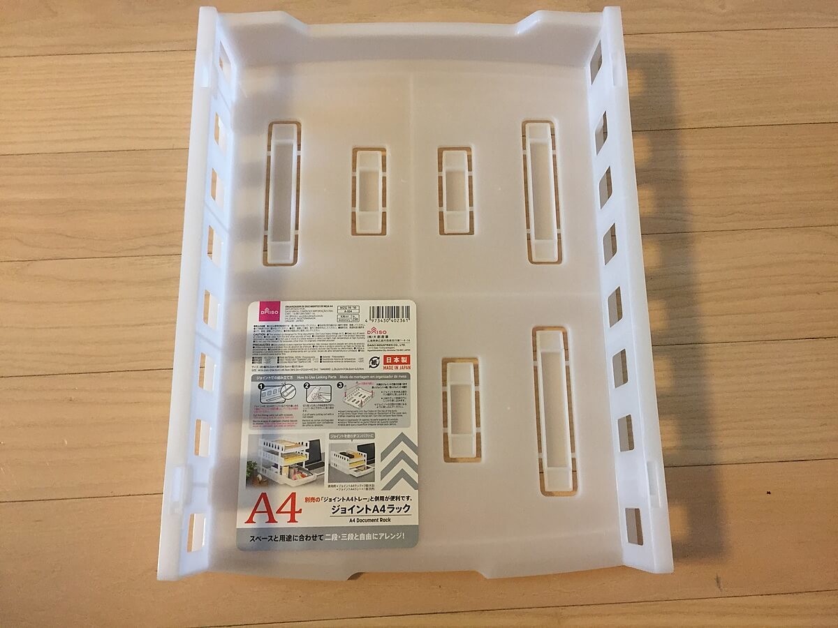 ジョイントA4ラック(税抜100円)のサイズは、幅26.2×奥行34.5×高さ5.9cmです。
