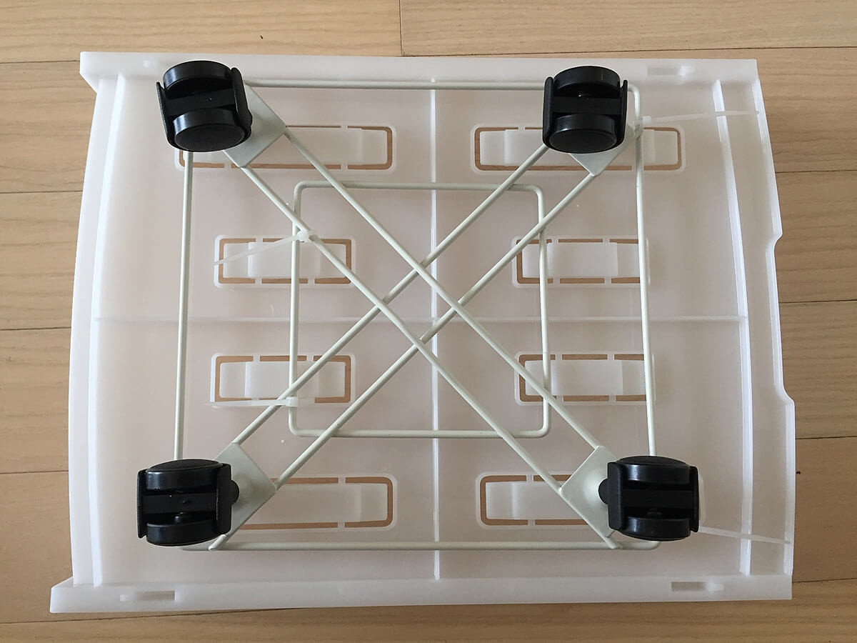 無印良品のほうは、専用のキャスターということもあり、安定感はまったく問題ありません。取り付けもキャスターを押し込むだけなので簡単です。