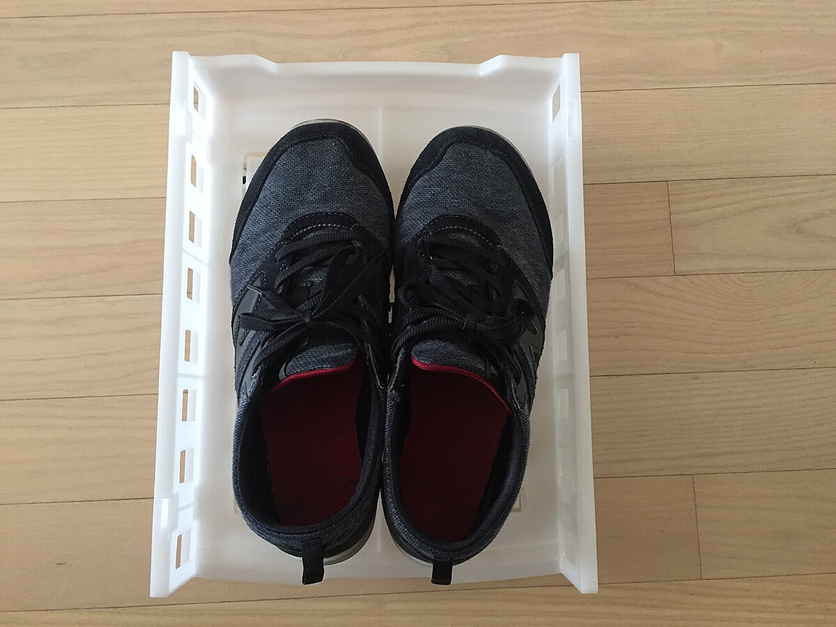 ダイソーのラックと同じく、男性用の靴でもしっかりと収まるサイズです。ダイソーとの違いは、ラックではないので、高さがないこと。