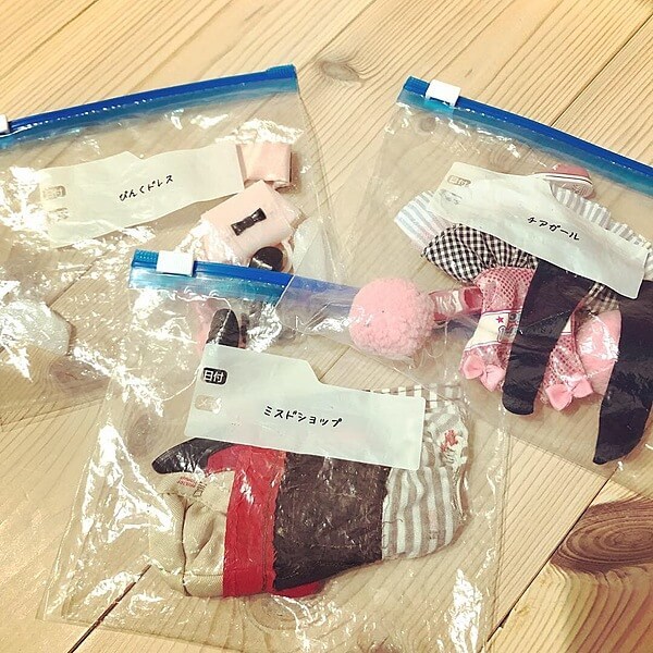 例えばリカちゃん人形のお洋服やヒールも、写真のようにそれぞれに袋を用意しておけば、子どもも分かりやすく進んでお片づけできます。