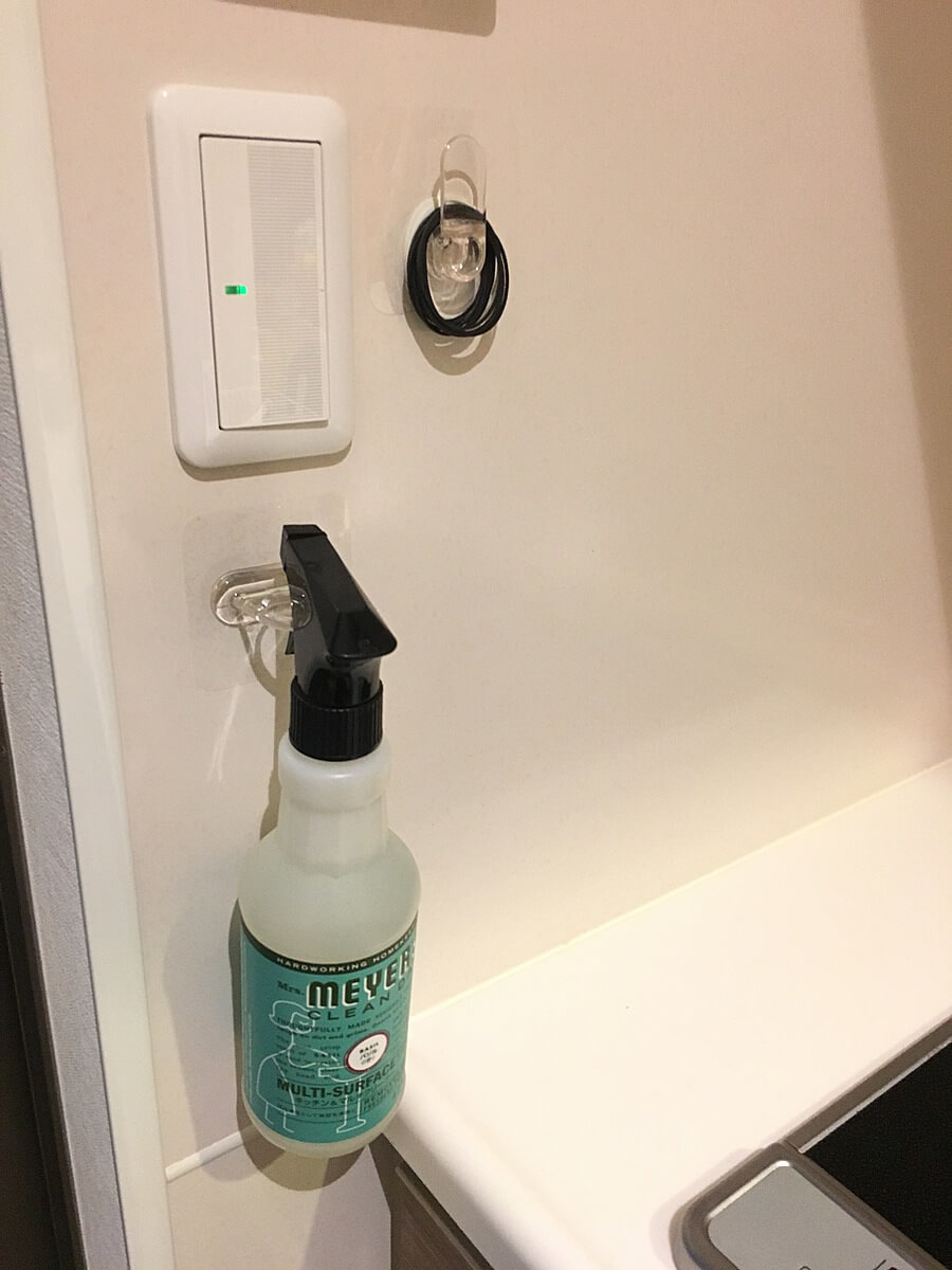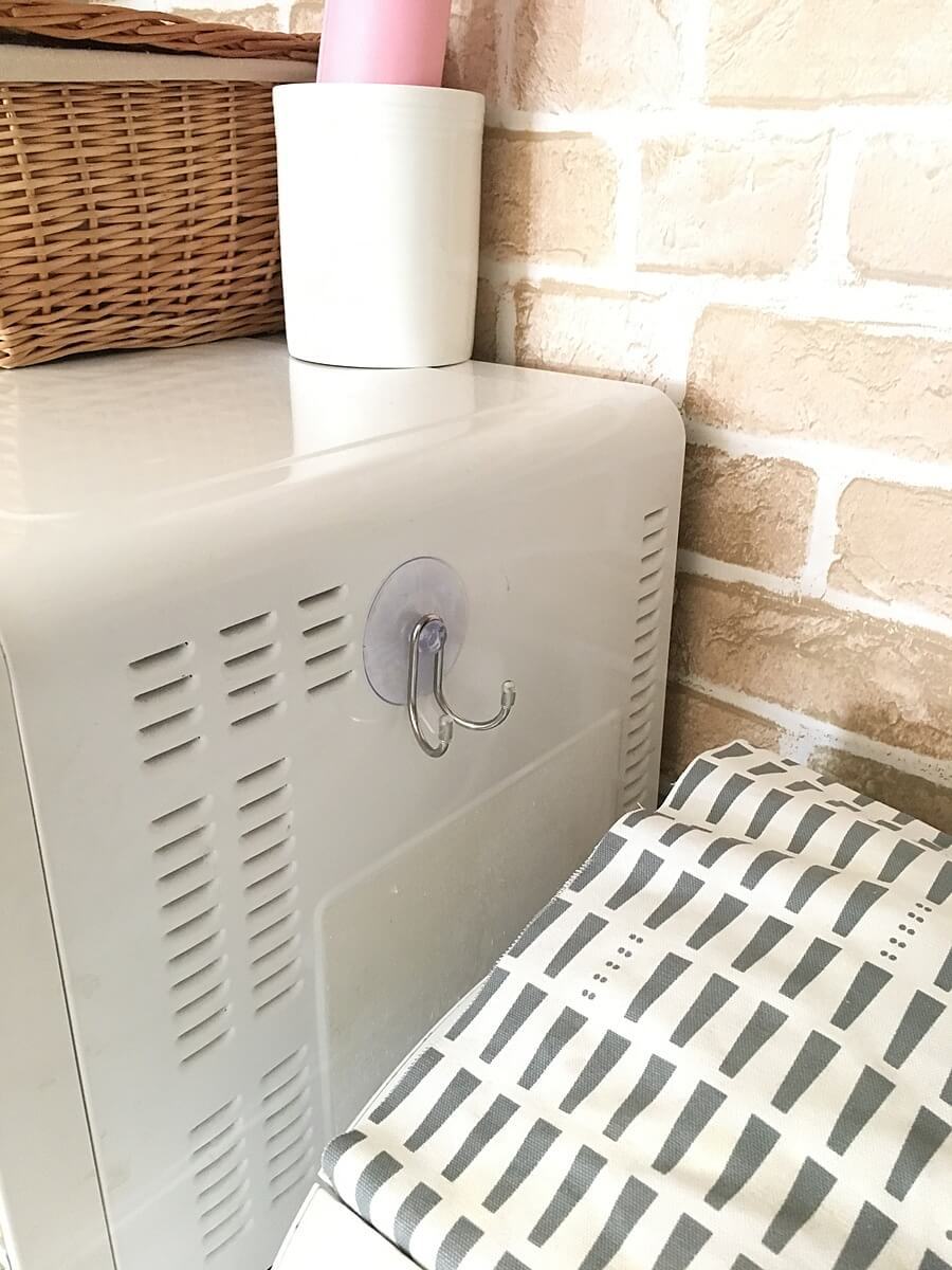 そこで、セリアの「2WAYホルダー」を使うことに。 お風呂場の湯おけやバスブーツの収納に適したフックですが、炊飯器横のオーブンレンジ側面に設置しました。