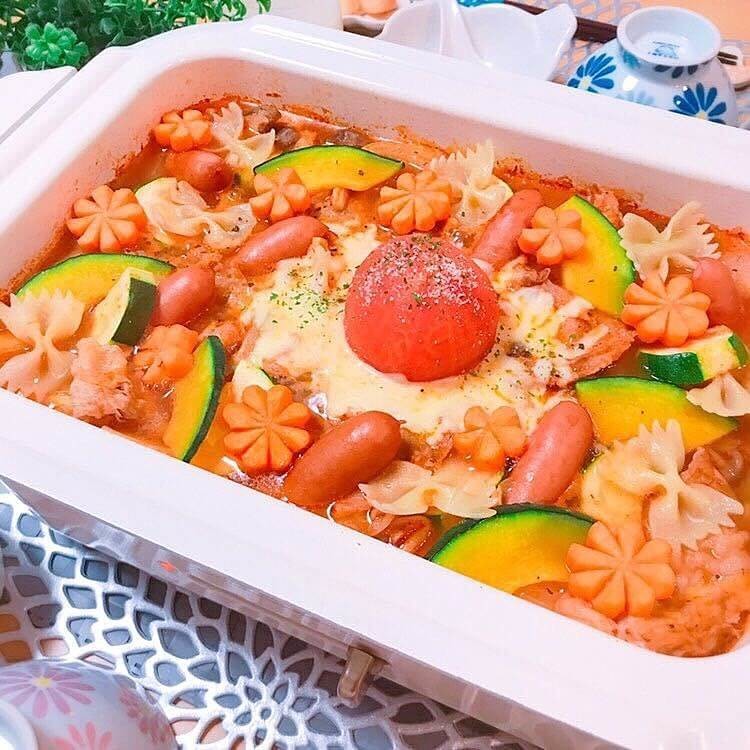 @n_1019_さんが考案した「リボンパスタ鍋」は、トマトを丸ごと入れたボリューム満点のミネストローネ鍋。