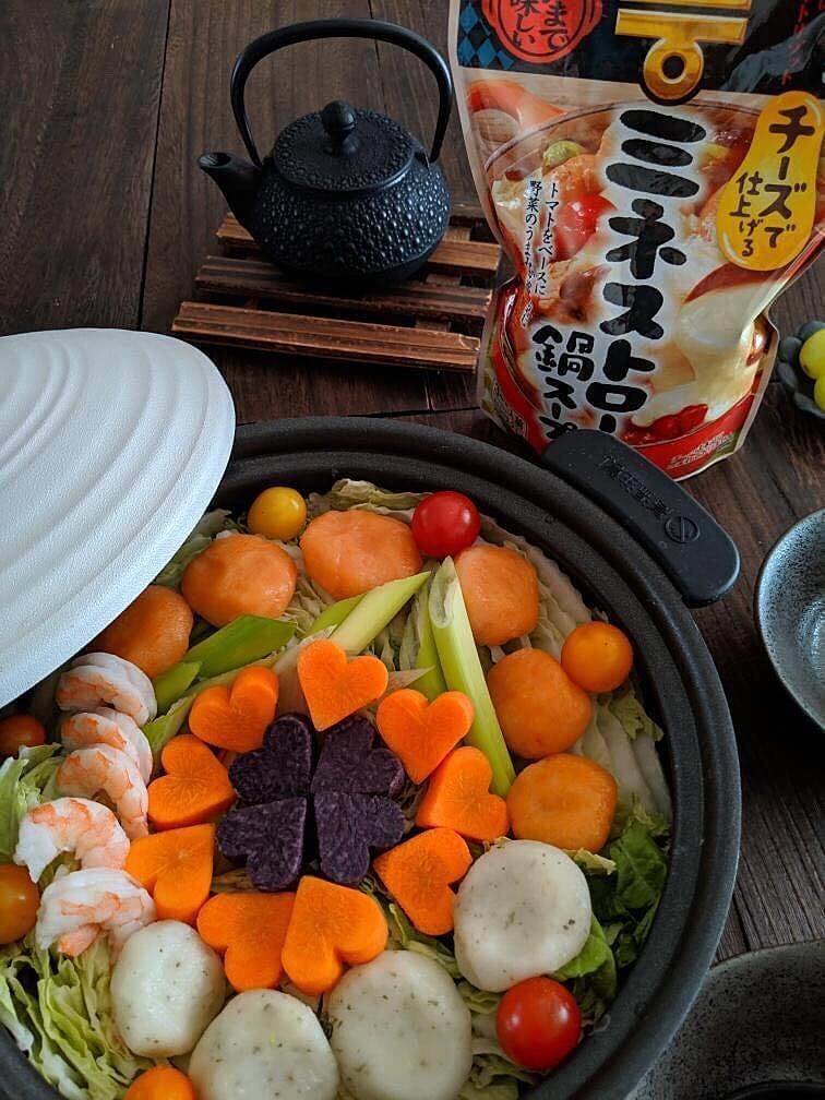 湯むきしたトマトを丸ごと入れて立体感を出して、見て楽しむ鍋を完成。とろけるチーズの上のトマトのインパクトはまさに“映え”アイデアです。
