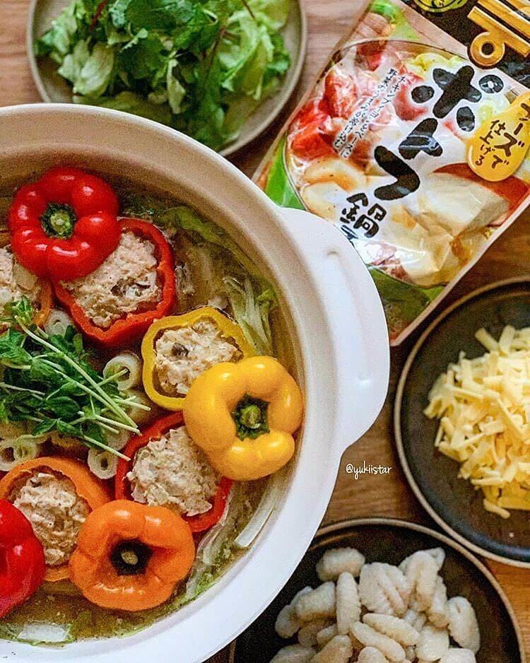 @yukiisutarさんは、普段おかずとして楽しむ肉詰めを、ポトフ鍋スープの中で煮込み、野菜もお肉も一緒に楽しめる鍋に仕上げました。パプリカの色がとっても華やかで、食卓が明るくなりますね。