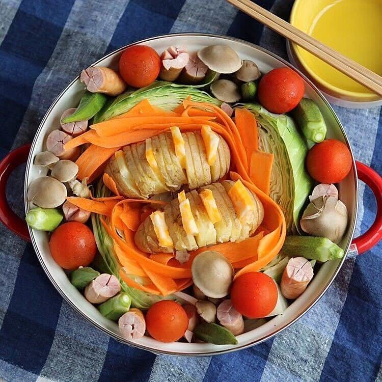 さらに@ikura888さんは、ポトフにベストマッチのメークインを使い、ハッセルバックポテト風に切り込みを入れ、チーズを挟んで鍋に入れた、洋風の鍋を完成。