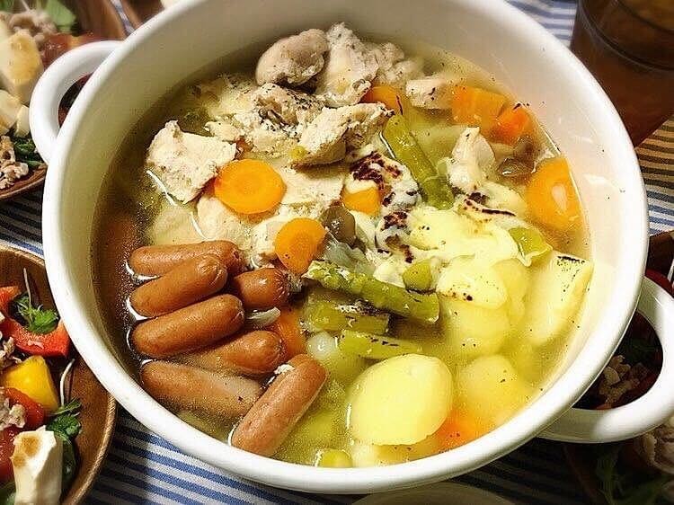 チキンブイヨンをベースとしたコクのあるスープは、ポトフ定番の野菜等で鍋を楽しんだら、鍋つゆをある程度残して、ごはんを入れて煮立たせたチーズリゾットにするのがおすすめ。