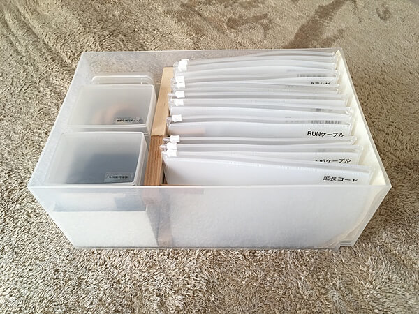 ケーブルや充電器など、いつの間にか増えてぐちゃぐちゃになっているコード類を、分類して収納。 こちらも「ポリプロピレンケース」の引出式にしまっています。