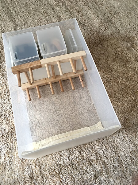 保管場所は、同じく無印良品の「ポリプロピレンケース」の引出式。