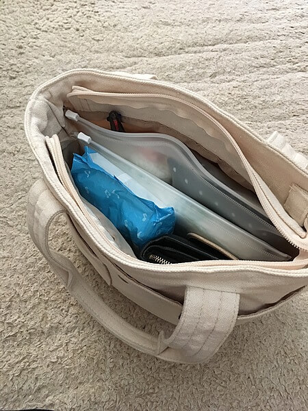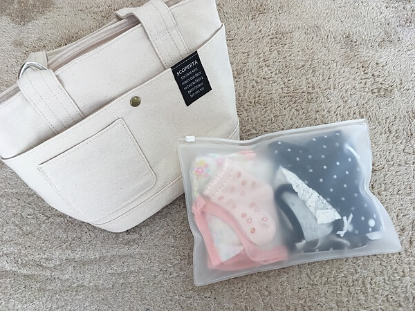 少しのオムツと一回分の着替えを入れて、小さなバッグで外出できます。