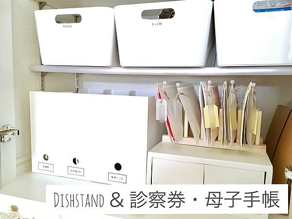 診察券や母子手帳を、家族ごとや病院ごとに分けて、ディッシュスタンドに立てて保管しています。