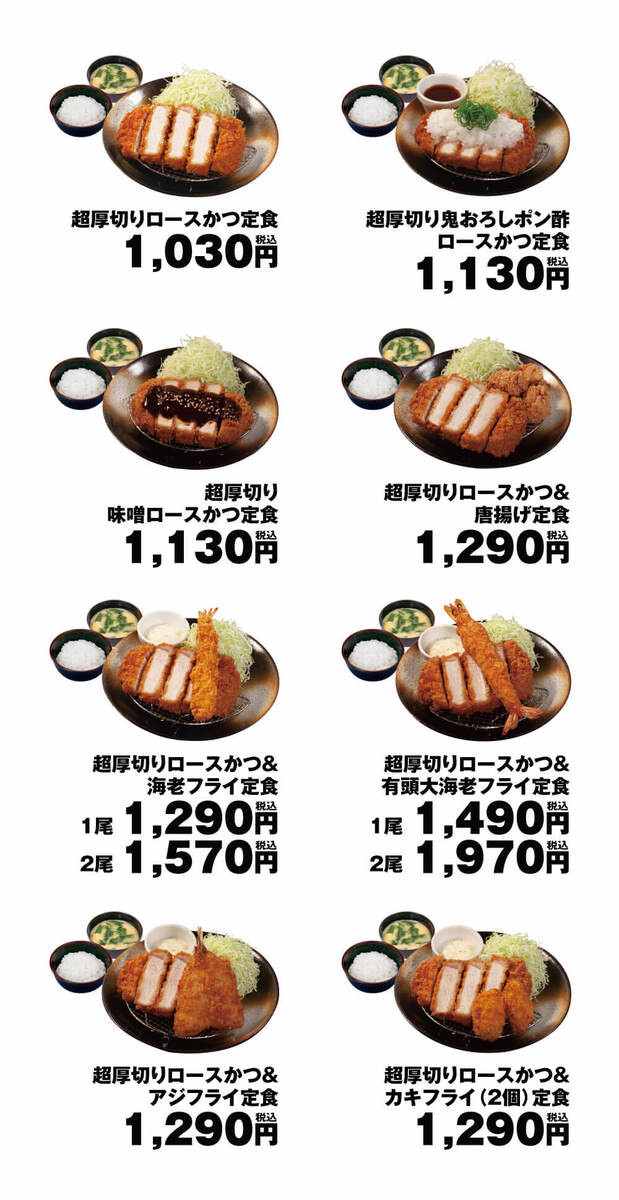 特製ソースも卓上にご用意しておりますので、お好みに合わせてお召し上がりいただけます。ロースかつのトッピングレギュラー陣「超厚切り鬼おろしポン酢ロースかつ定食」「超厚切り味噌ロースかつ定食」の他、唐揚げや海老フライとの盛合せ定食などバラエティ豊かにご用意しております。