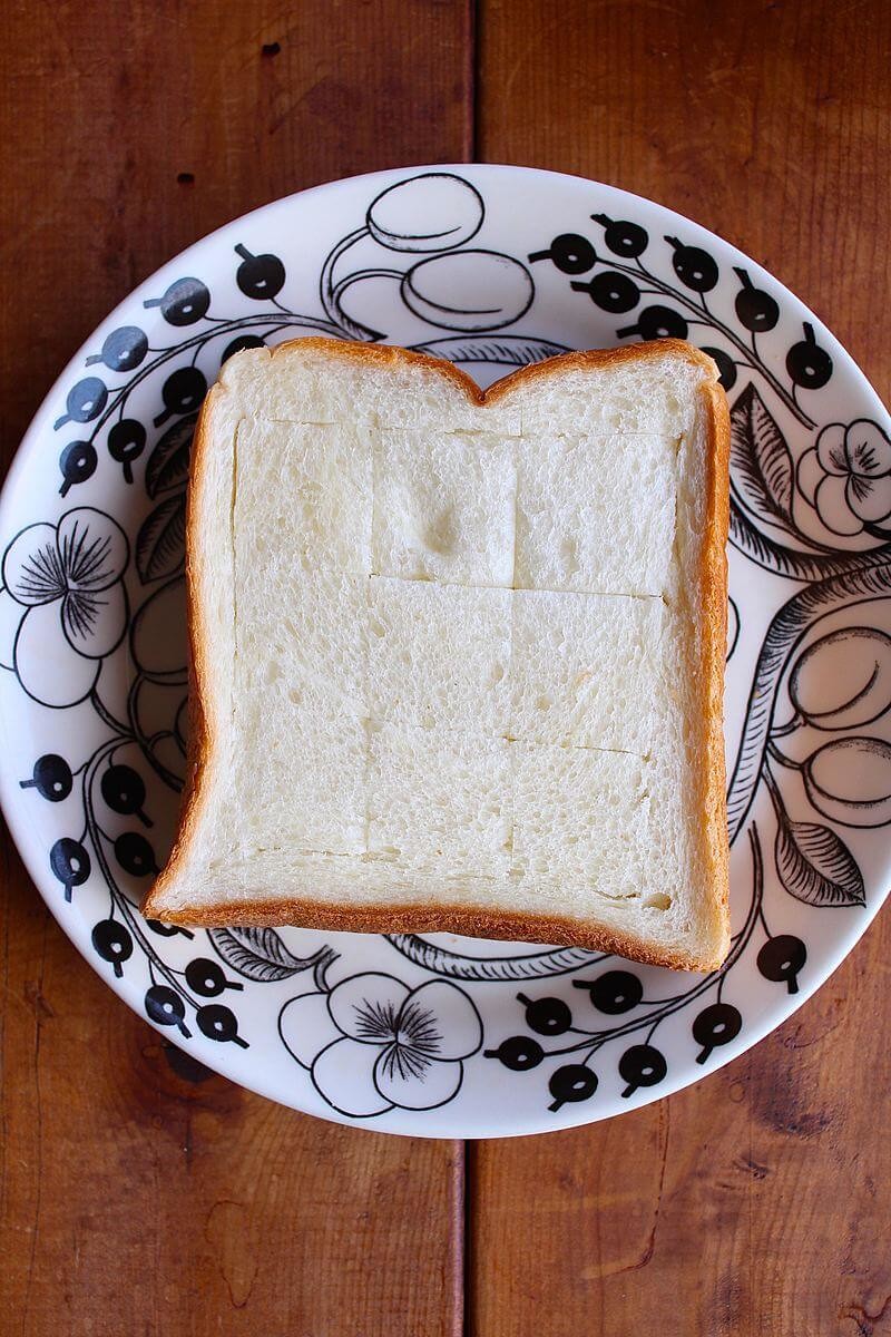 (1)まずは、食パンの耳の内側をぐるっとナイフで切り込みを入れ、縦と横にも2本ずつ切り込みを入れます。