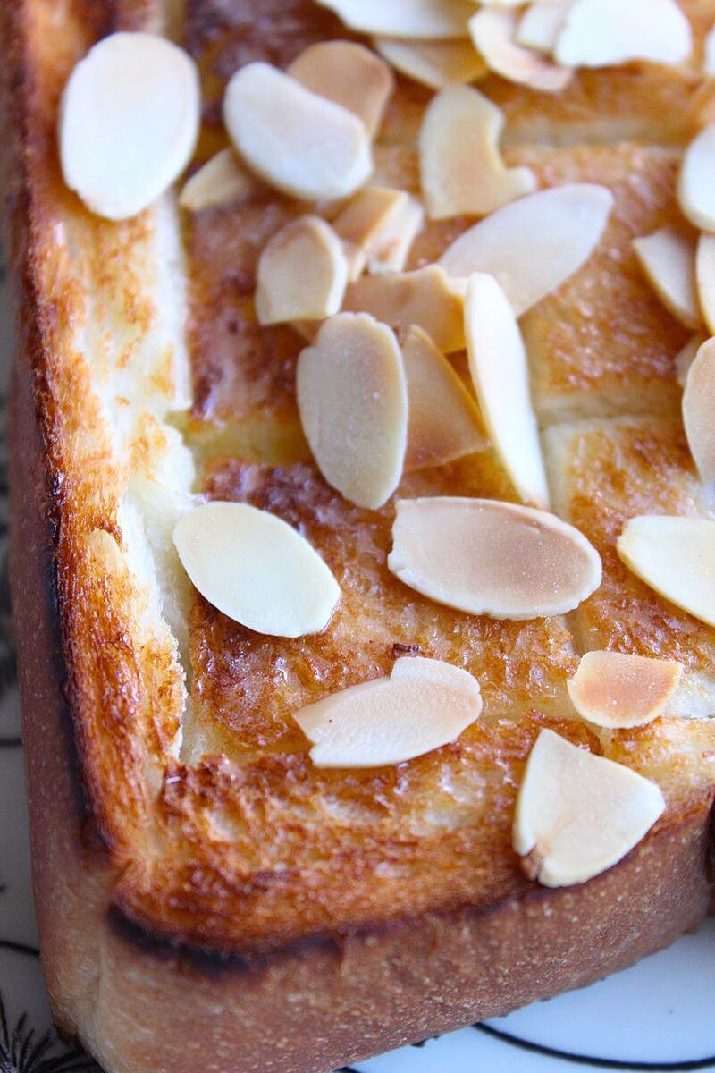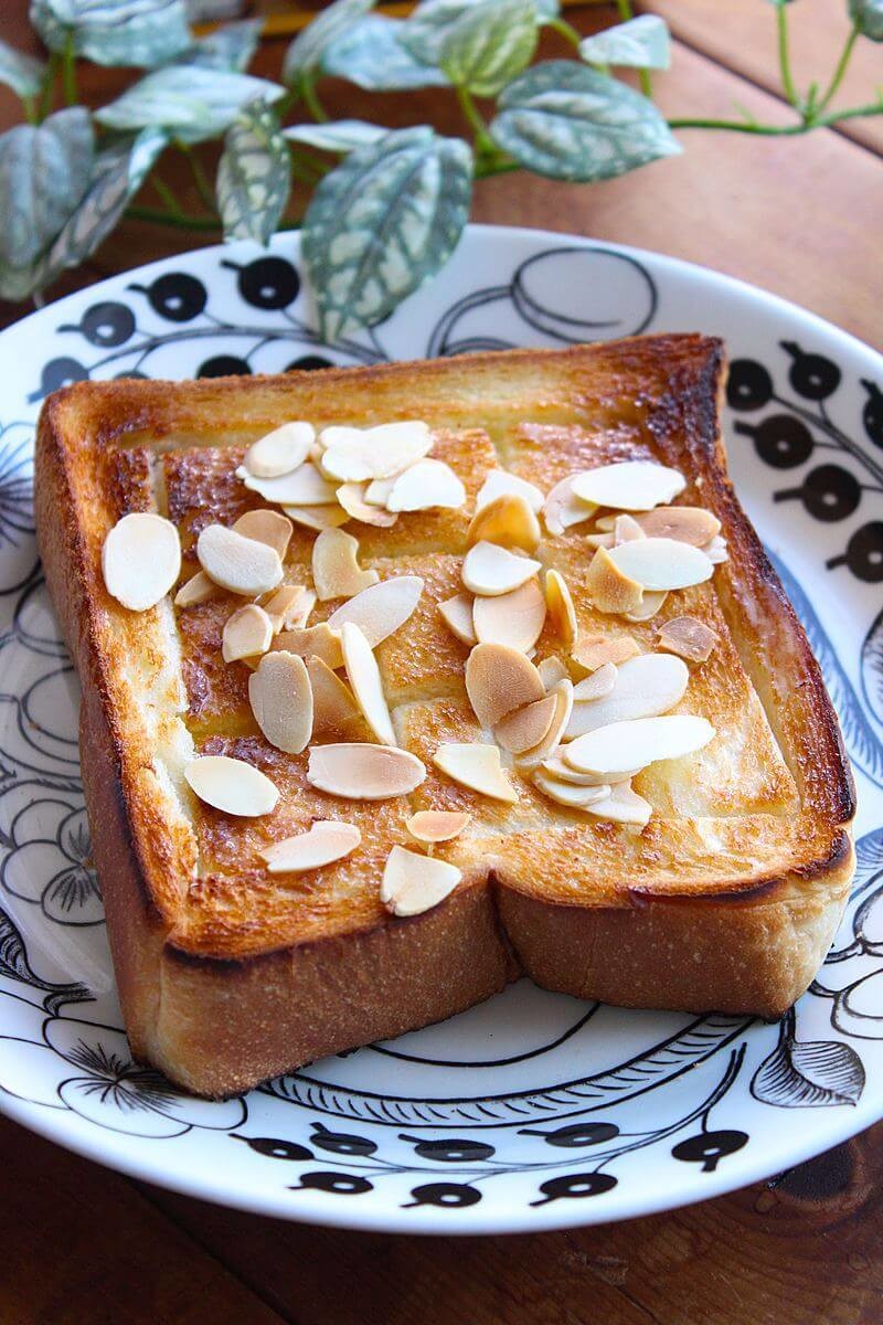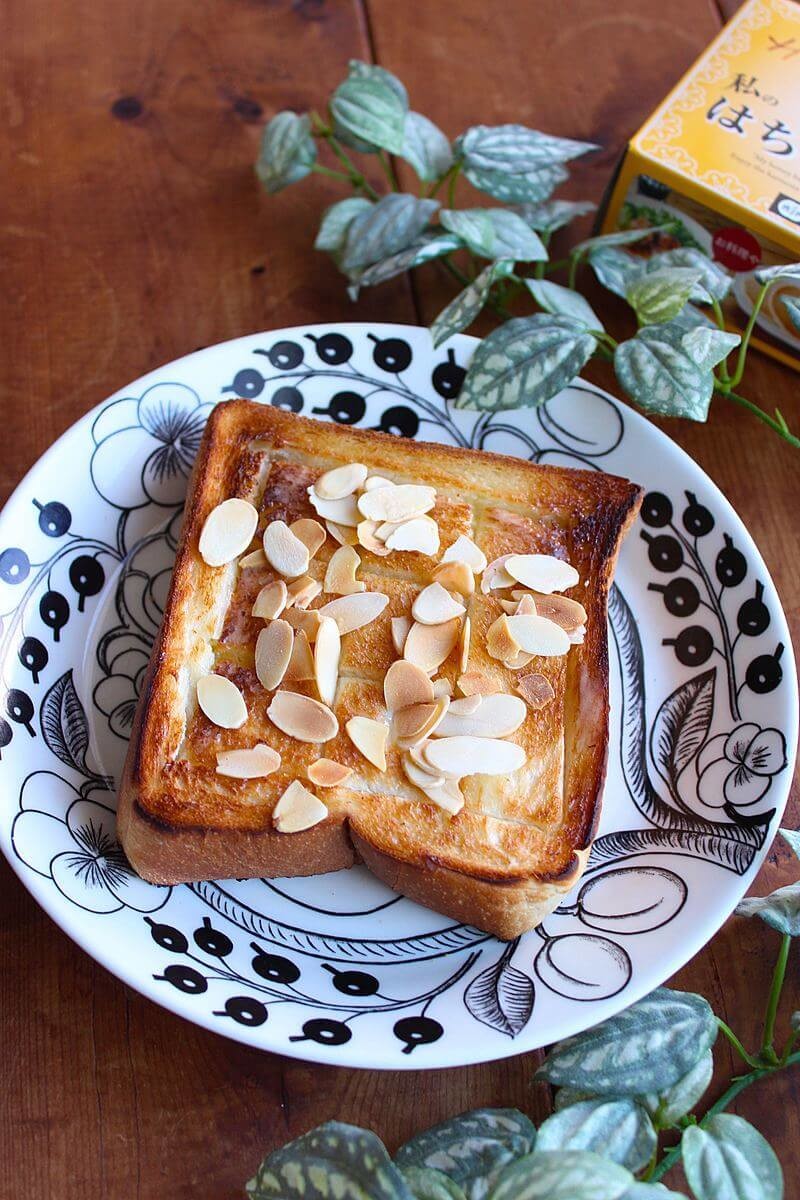 (3)焼けたパンに「はちみつバター」をたっぷり塗り、お好みで軽く炒ったスライスアーモンドをトッピング!
