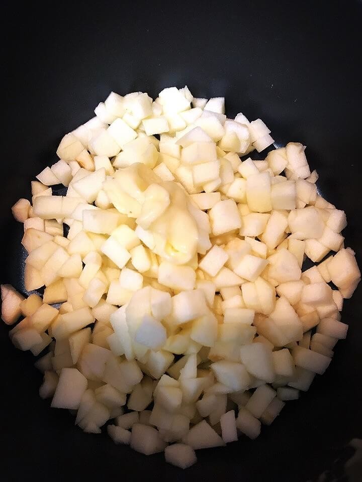 (1)りんごの皮を剥き芯を取り除く。5mm角にカットします。