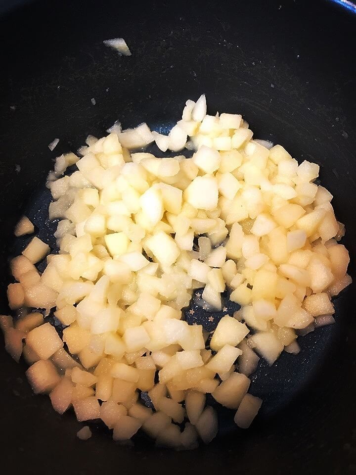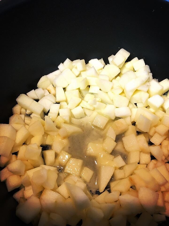 (2)カットしたりんごと「はちみつバター」を入れて、火にかけます。