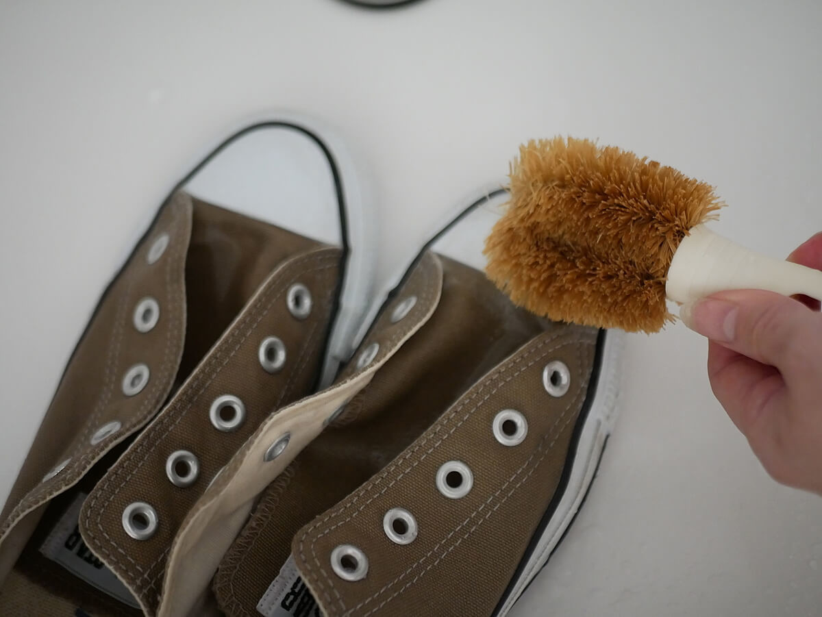 では早速試してみましょう。 今回は一旦石鹸で全体を洗い、白のラバー部分も石鹸とブラシでしっかり擦った状態からのスタートです。