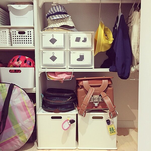 ボックスの中には、週末にだけ持ち帰る上靴やお着替えかばんを収納し、日常使いの通園かばんやランドセルはふたの上を置き場所に。