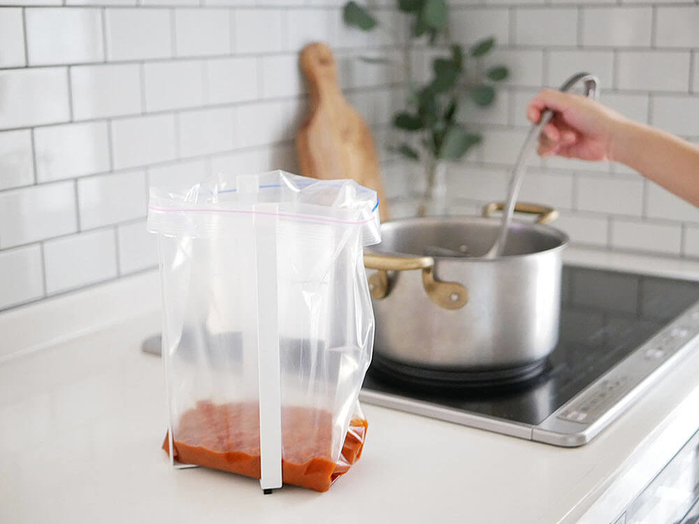 そんな時にも役立つんです! ホルダーにフリーザーバッグをかければ、袋の口が大きく開くのでストレスなく移し替え作業ができちゃいます。 一度使ったら手放せなくなること間違いなしです!