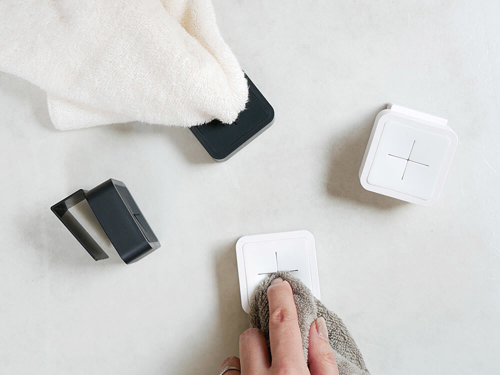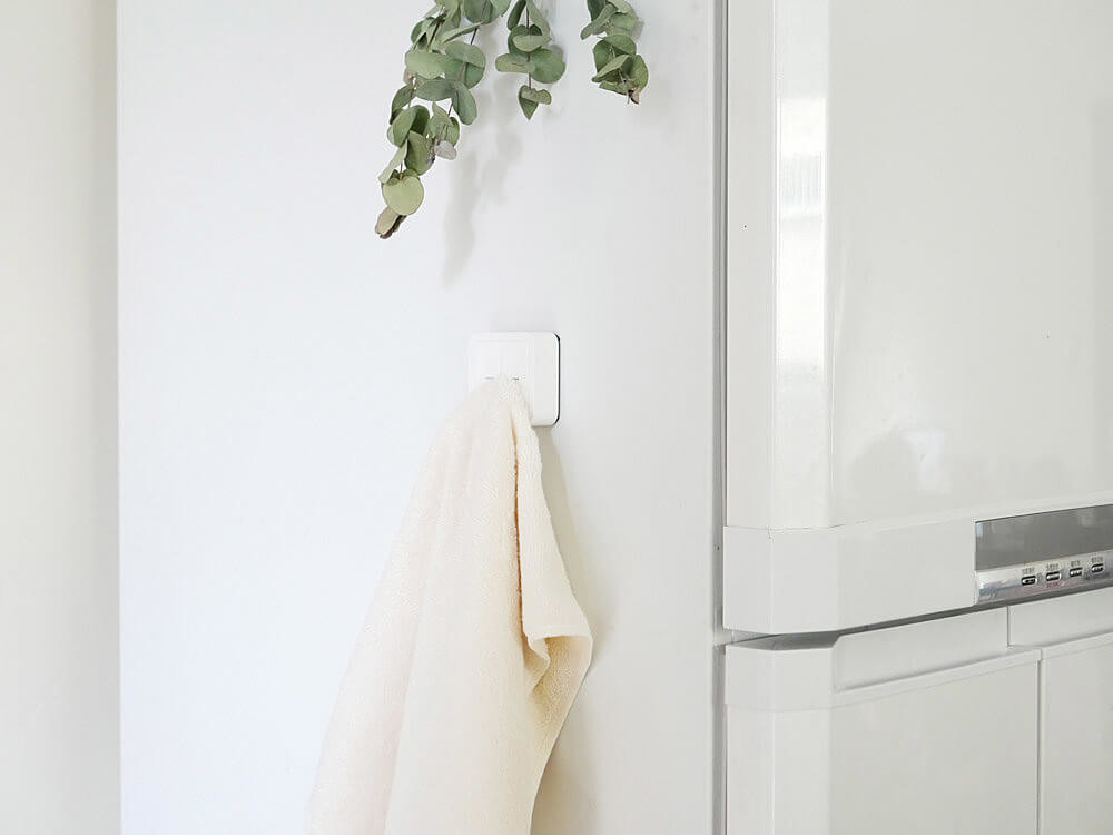 学校のお便りや、キッチンペーパーなど何かと取り付けてしまいがちな冷蔵庫の側面にも、約5.5×5.5cmのスクエア型なので、場所を取らずにスリムにタオルを掛けられます。