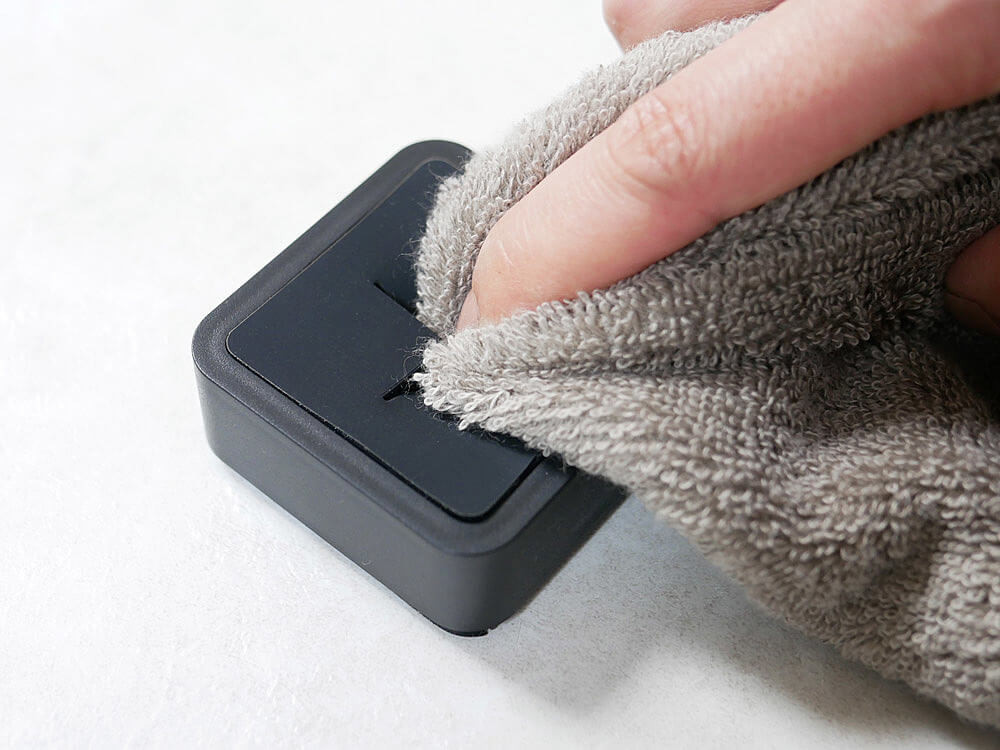 ABS樹脂でできた枠に、差し込み部分はシリコン製。 タオルをつまんでホルダーの十字の切れ目に指で差し込むだけ。