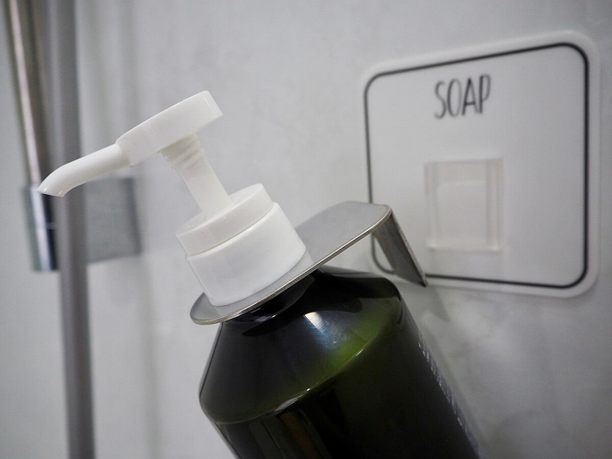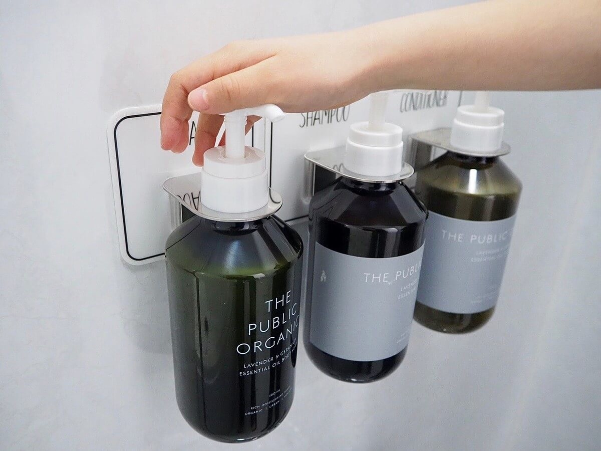 実際に壁にくっつけたままポンプを押してもズレたり落ちたりした事は一度もありません。詰め替えの時もサッと外せるのでとってもスムーズです。