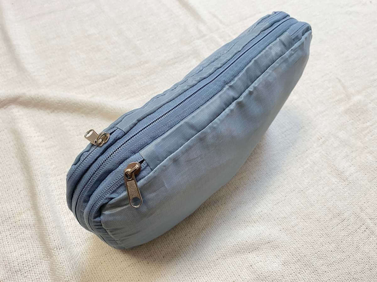 衣類をしまったら、真ん中のチャックを閉めます。こうすることで、マチがギュッと収納されて、薄くコンパクトになるんです!