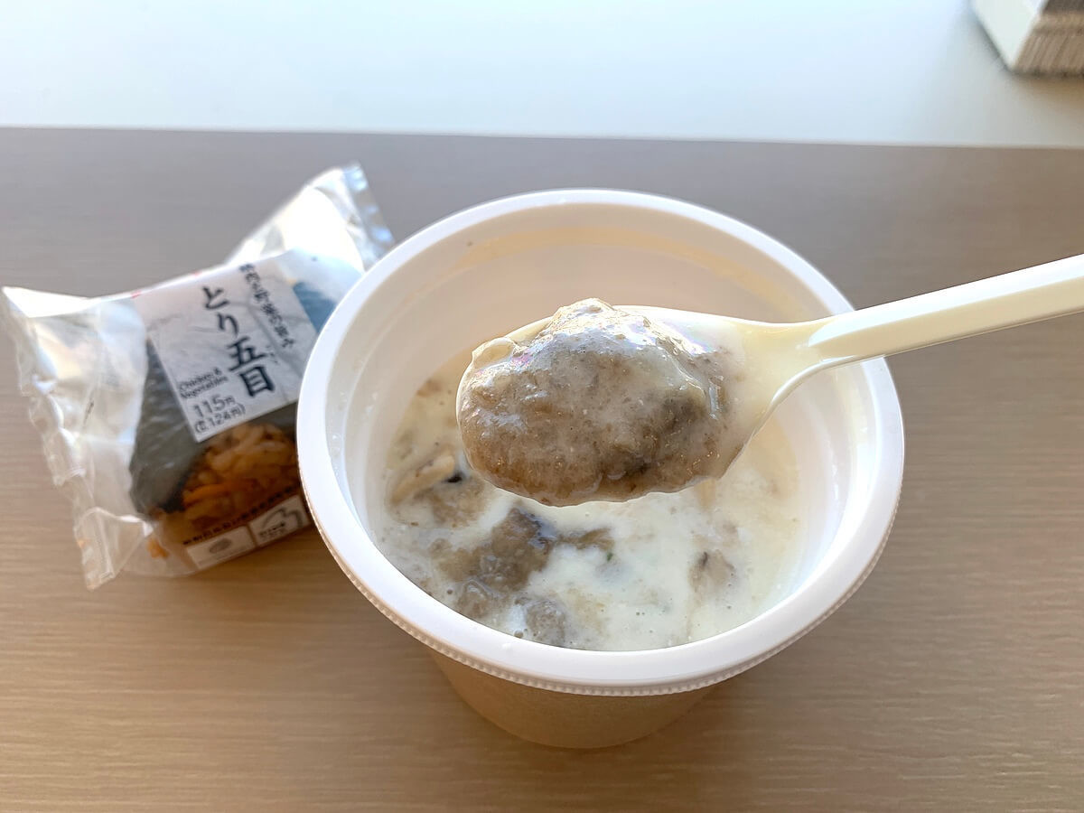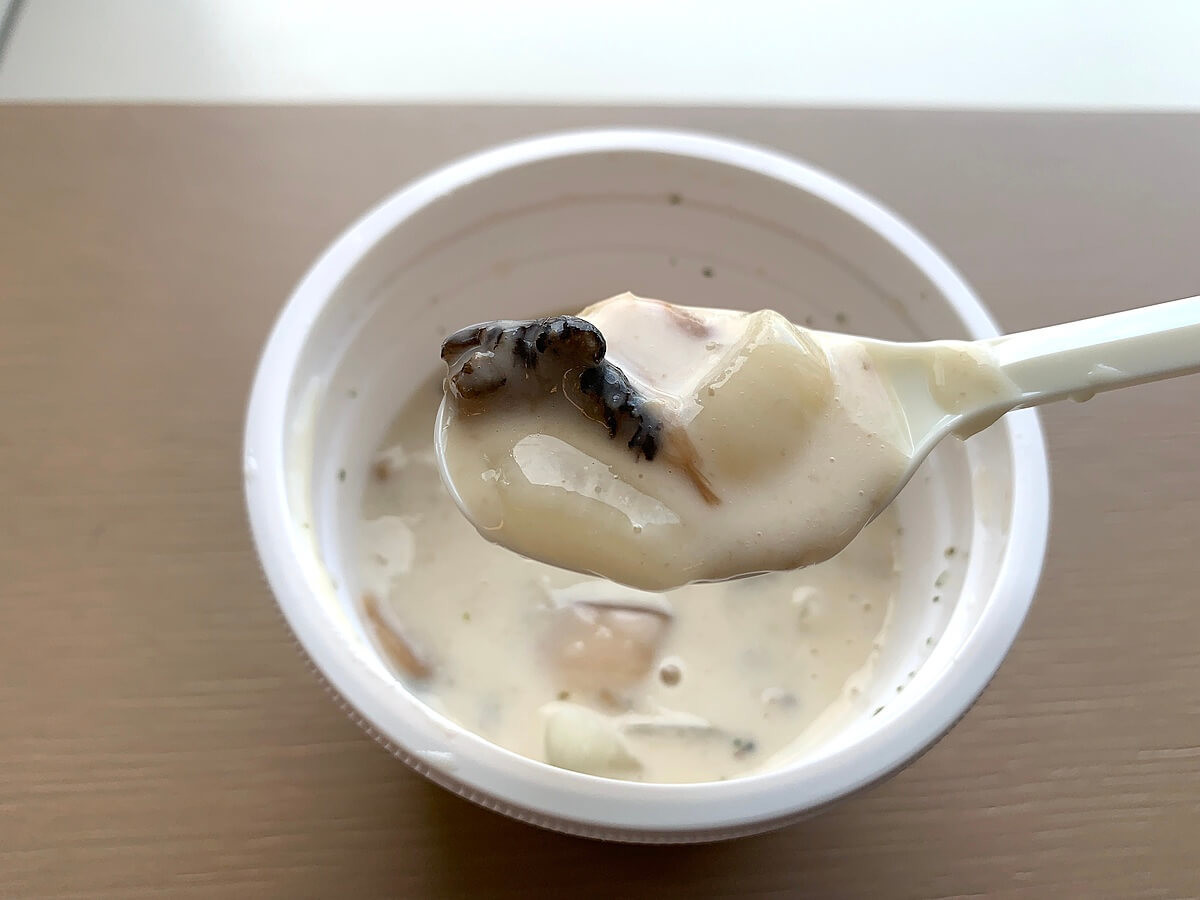 パッと見ると、白いスープなのですが、スプーンですくってみるとこんなものが。