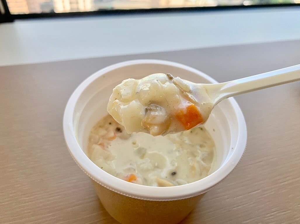 最近のセブンイレブンのクラムチャウダーは、玉ねぎがちょっとシャキシャキしていて、なーんか好みじゃないんですよね。もうちょっとクタッとしている方が、このクラムチャウダーには合うと思うんです。