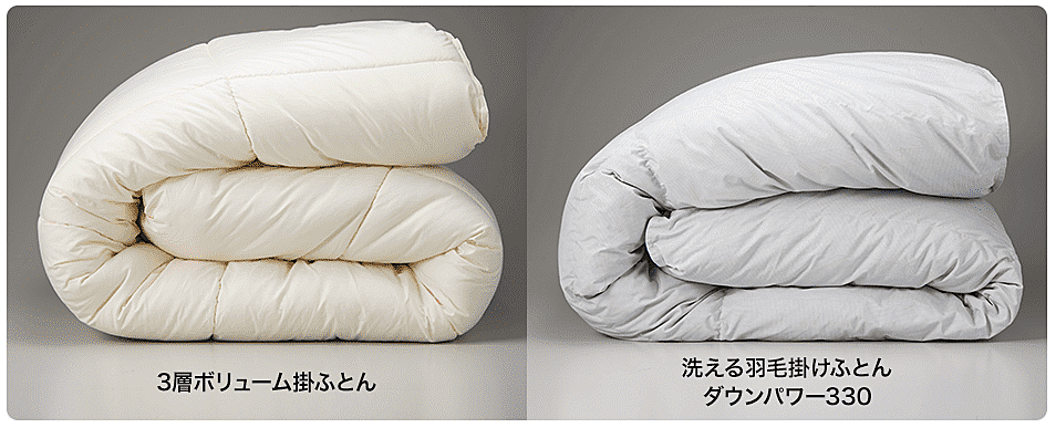 ダウンパワー330の羽毛ふとんと比較してみても、こうしてひと目でわかるボリューム感。同時にイオンの機能性掛ふとんは、羽毛ふとんに匹敵するあたたかさも追求しています。
