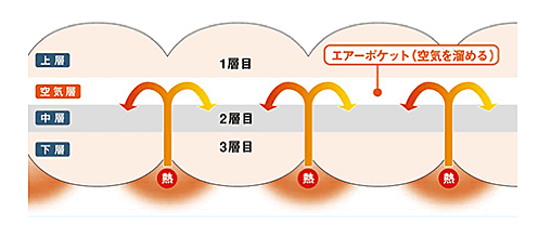 「3層+エアポケット構造」とは、空気を3層の中わたで挟み、保温性を高めた設計のこと。