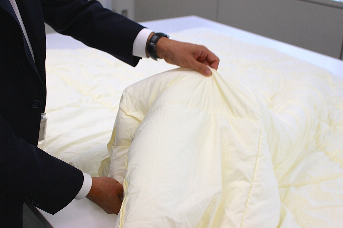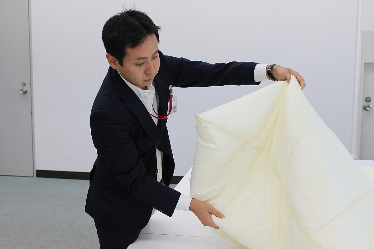 また、機能性掛ふとんの開発にあたって、たとえ合成繊維でも、羽毛に負けないあたたかさと品質向上に取り組んでいるのだそうです。