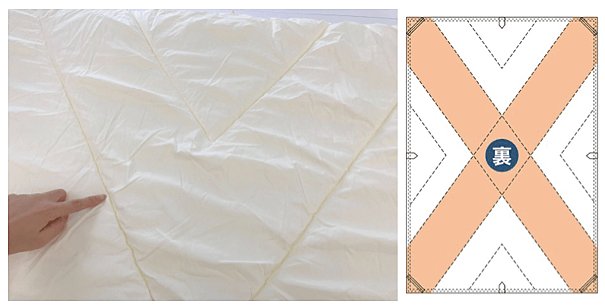布は直線よりもななめに切り込みが入っている方が、人の体に沿うんです。体の形にフィットして、床にふとんがフワッと落ちる感じ。体が包まれる形で、X字になっています。フィットしていなかったら、外気が入ってあたたかさが逃げやすくなってしまいます。