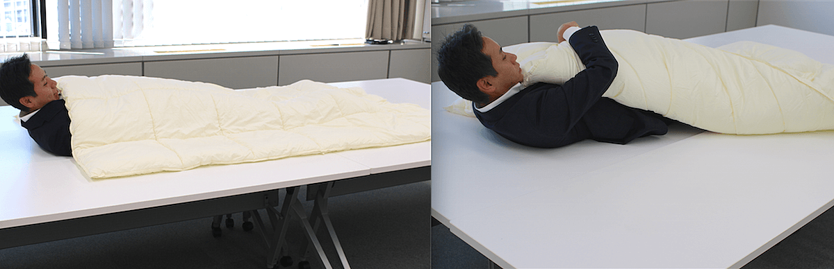 寝てみるのが一番わかりやすい!と、実際にふとんをかけて説明してくれた阿部さん。