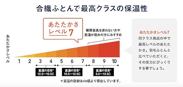 そのひとつの指標が、イオンで独自に設けた「あたたかさレベル」です。従来品は、合成繊維だとレベル4〜5あたり。一方で羽毛は、7〜9レベル。この羽毛レベルに限りなく近いあたたかさを追求した結果、この機能性掛ふとんは、あたたかさレベル7を実現しました。