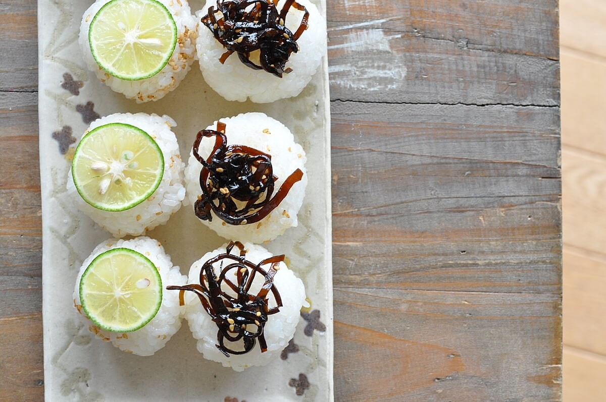 すだちのおにぎりと、こんぶのおにぎり。すだちのおにぎりはご飯に白ごまを和えて塩にぎりにしたものに、すだちをのせました。