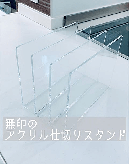 無印良品のアクリル仕切りスタンドを使い、それぞれ立てるとスッキリスリムに。 幅をとらずに自立してくれるので一つずつ取り出しやすく、使い勝手も良さそうですね。