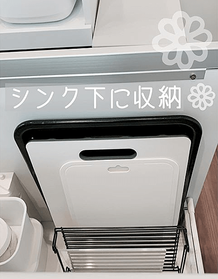 @wako0922さんは、深さのあるシンク下の引き出しを利用し、まな板とヘルシオの角皿、調理網など大きなものを立てて収納しています。